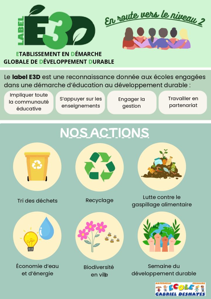 L'école est engagée dans une démarche environnementale. Depuis quelques années, nous sommes labellisés Label E3D ( Démarche globale de Développement Durable) et nous souhaitons faire évoluer notre labellisation.