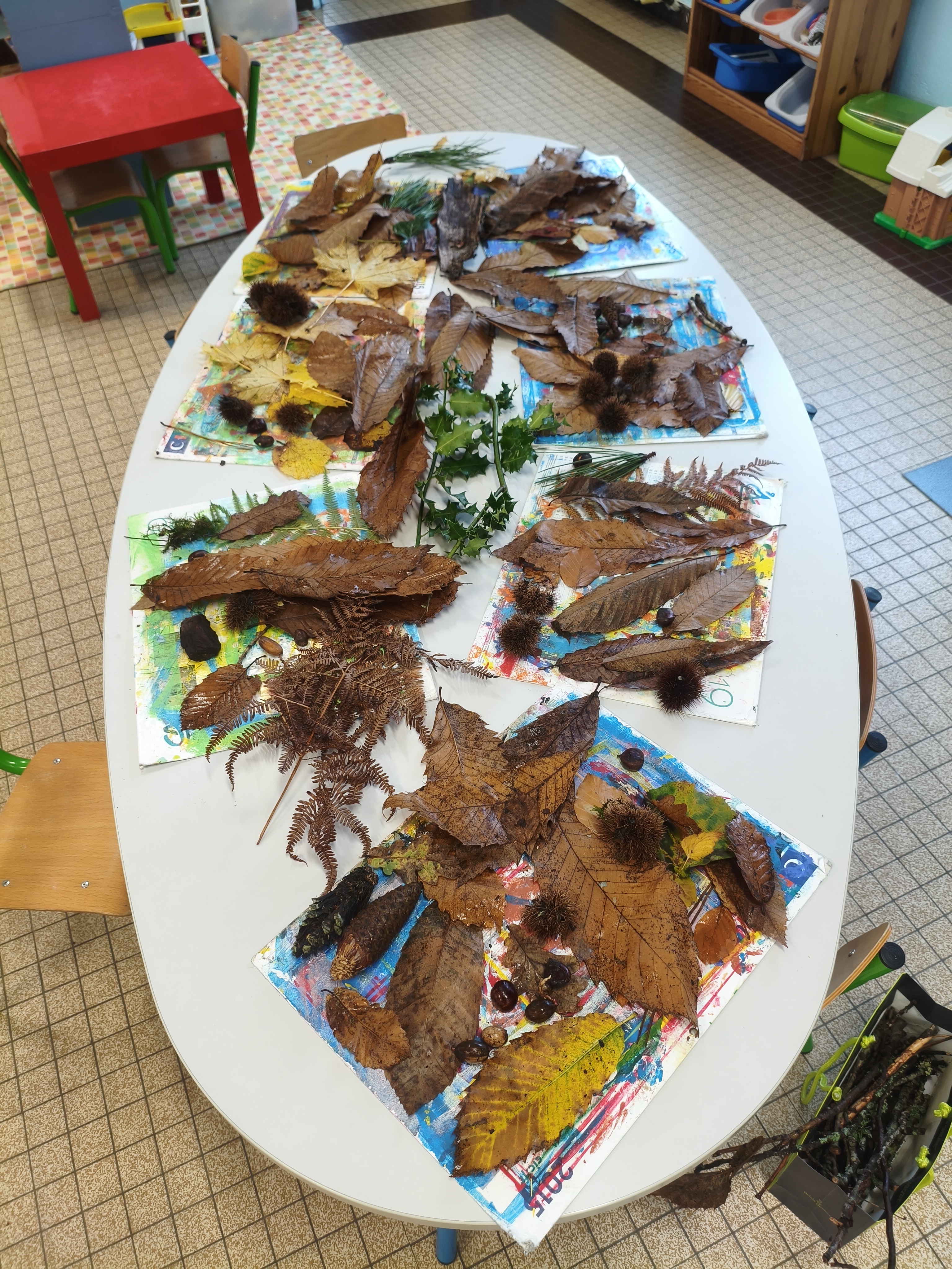 Une fois en classe, différents ateliers ont été proposés en lien avec ces trésors: land art, faire un bonhomme, loto, traces et empreintes…